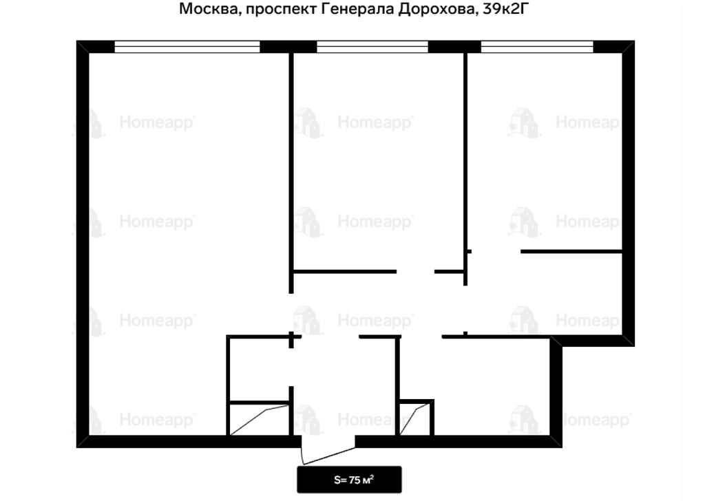 Планировка "Евро-Трешка" (75.3 м2): Идеальное функциональное зонирование. Просторная кухня-гостиная для приема гостей и семейных ужинов, две изолированные комнаты (спальня и кабинет/детская), два санузла.